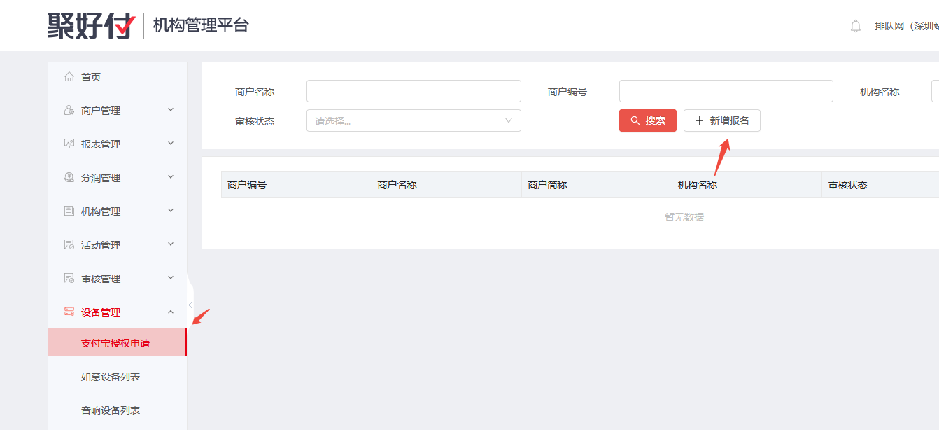 (1)代理商登录机构后台 ams.paidui.cn 在设备管理->支付宝授权申请->新增报名