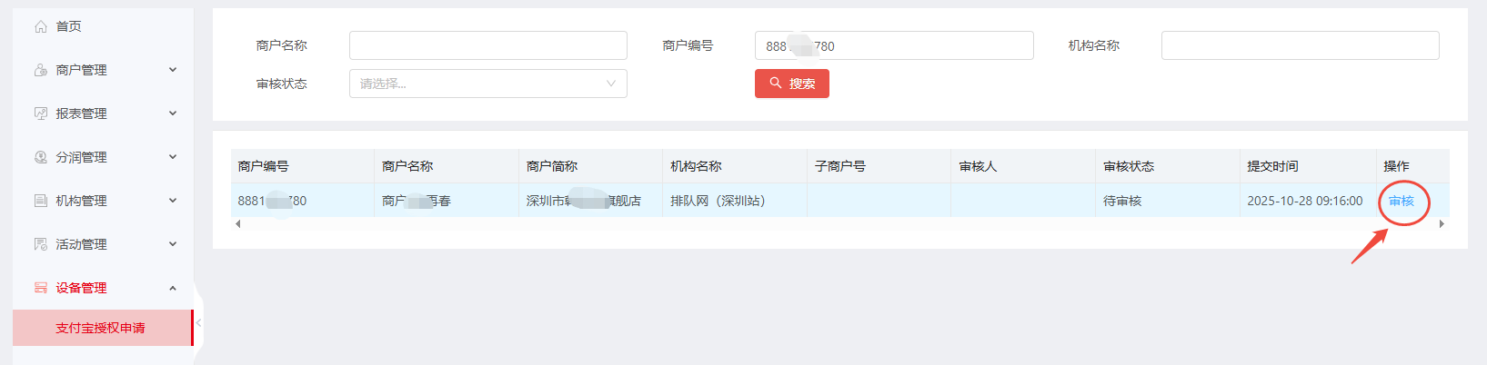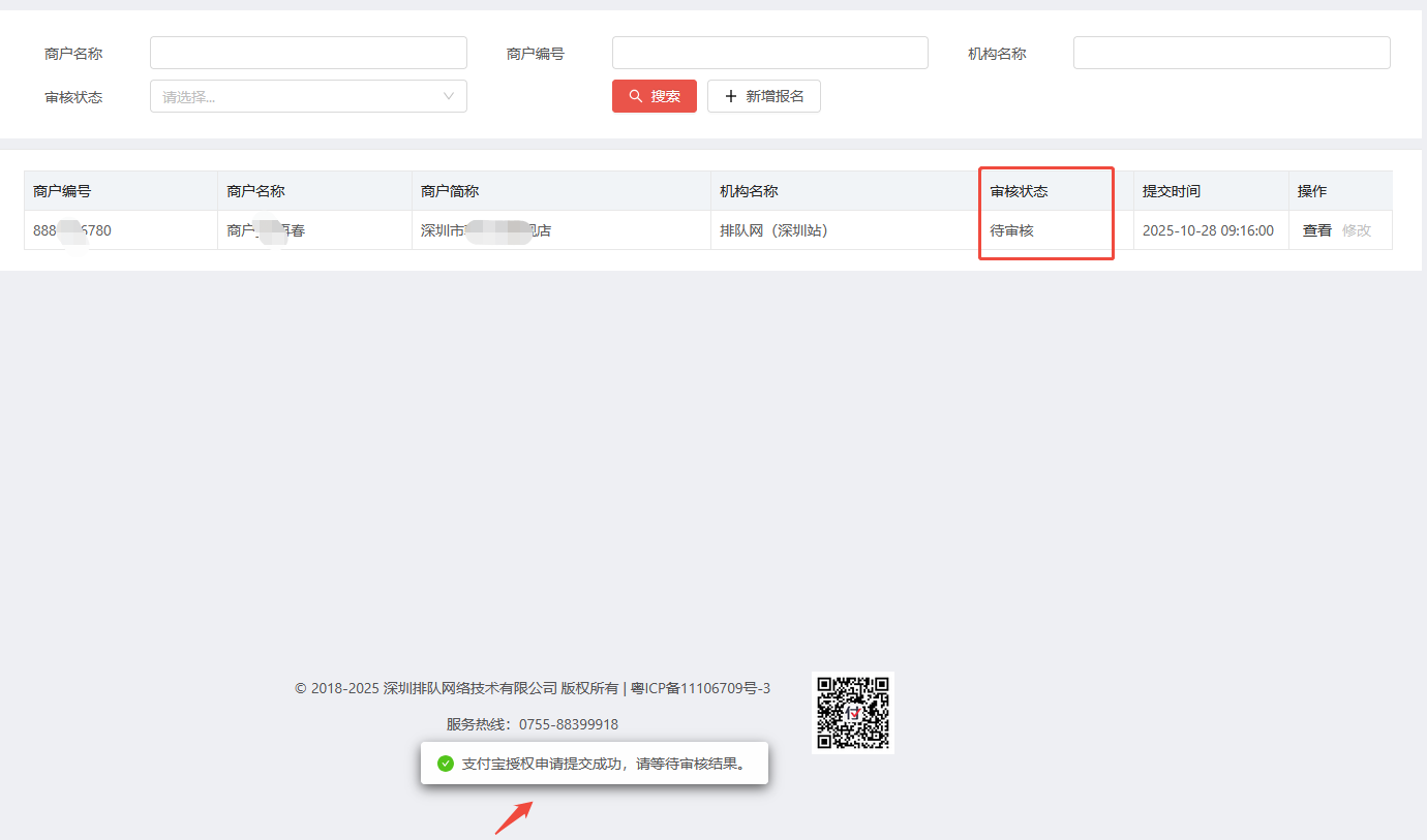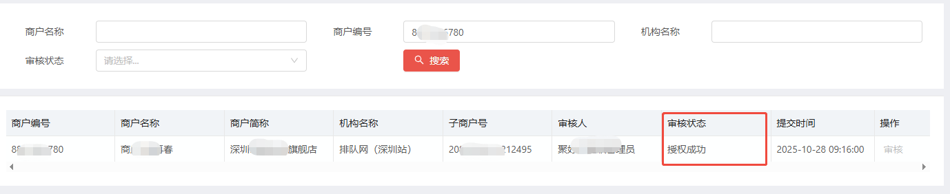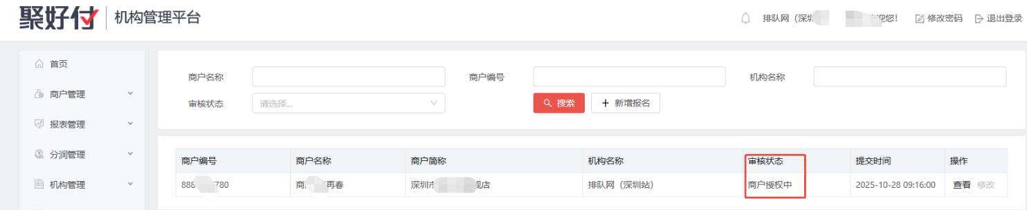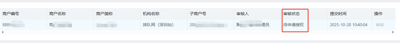 (3)总部审核提交申请后,审核状态会显示待申请授权,变更为商户授权中状态。