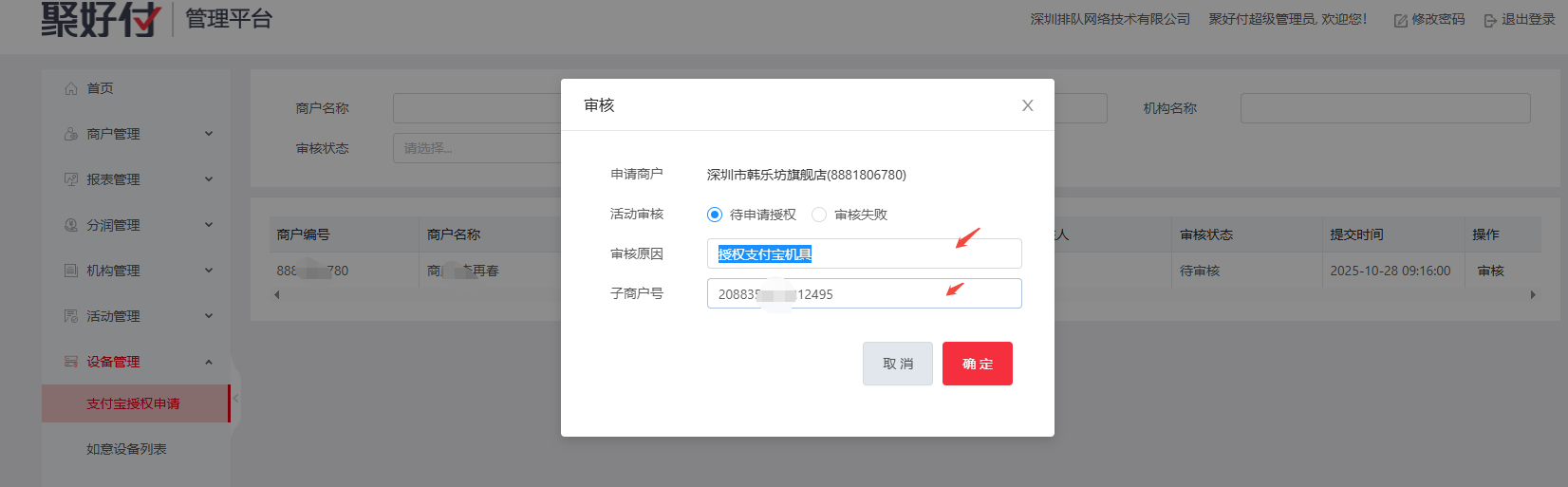 输入审核原因和商户支付宝商户号,提交支付宝官方等待审核结果,代理商可以在ams管理后台刷新查看审核状态进度。