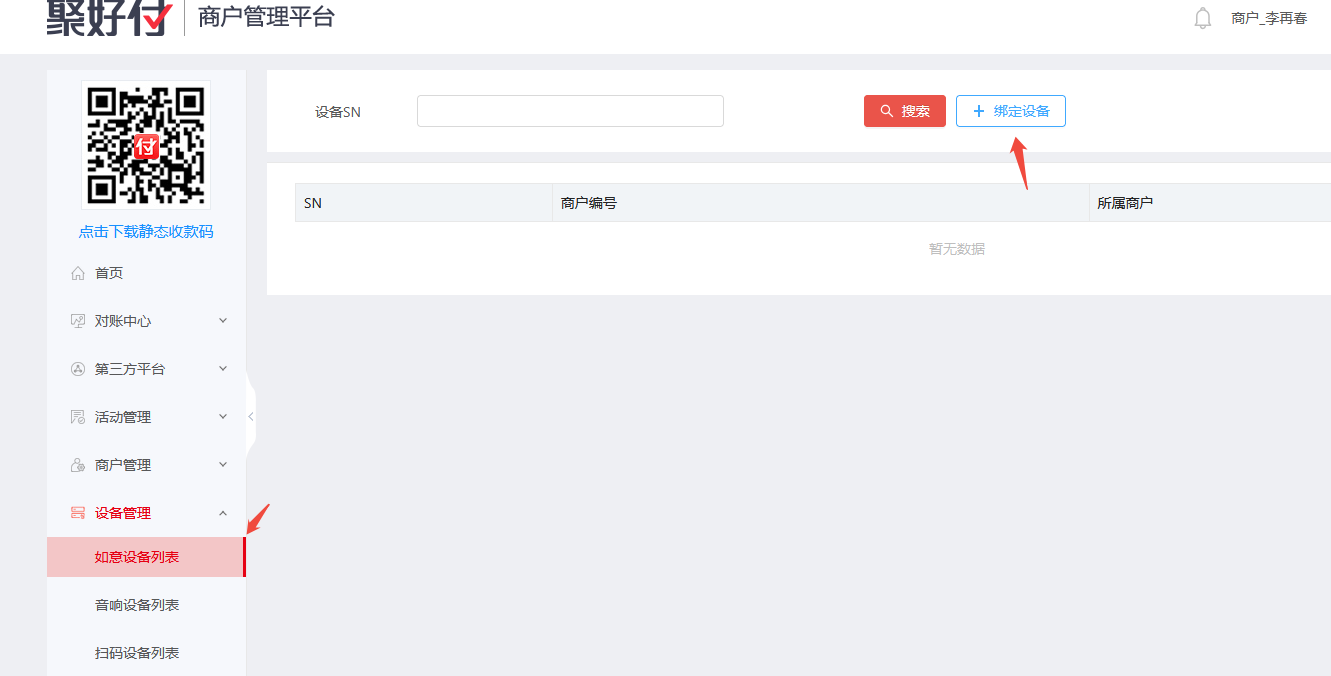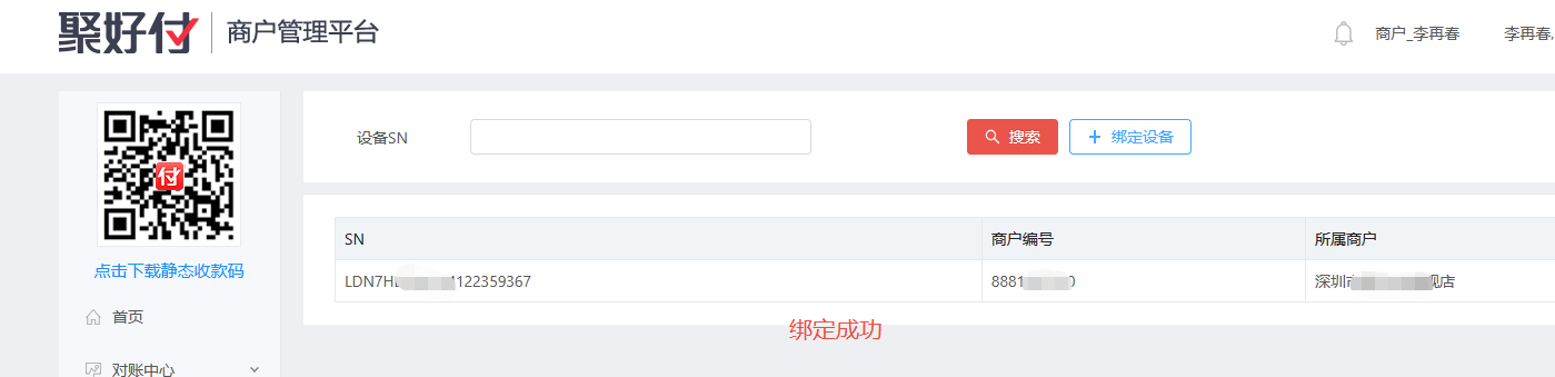 登录聚好付商户后台 mms.paidui.cn 在设备管理->如意设备列表->绑定设备->输入设备SN->绑定成功。