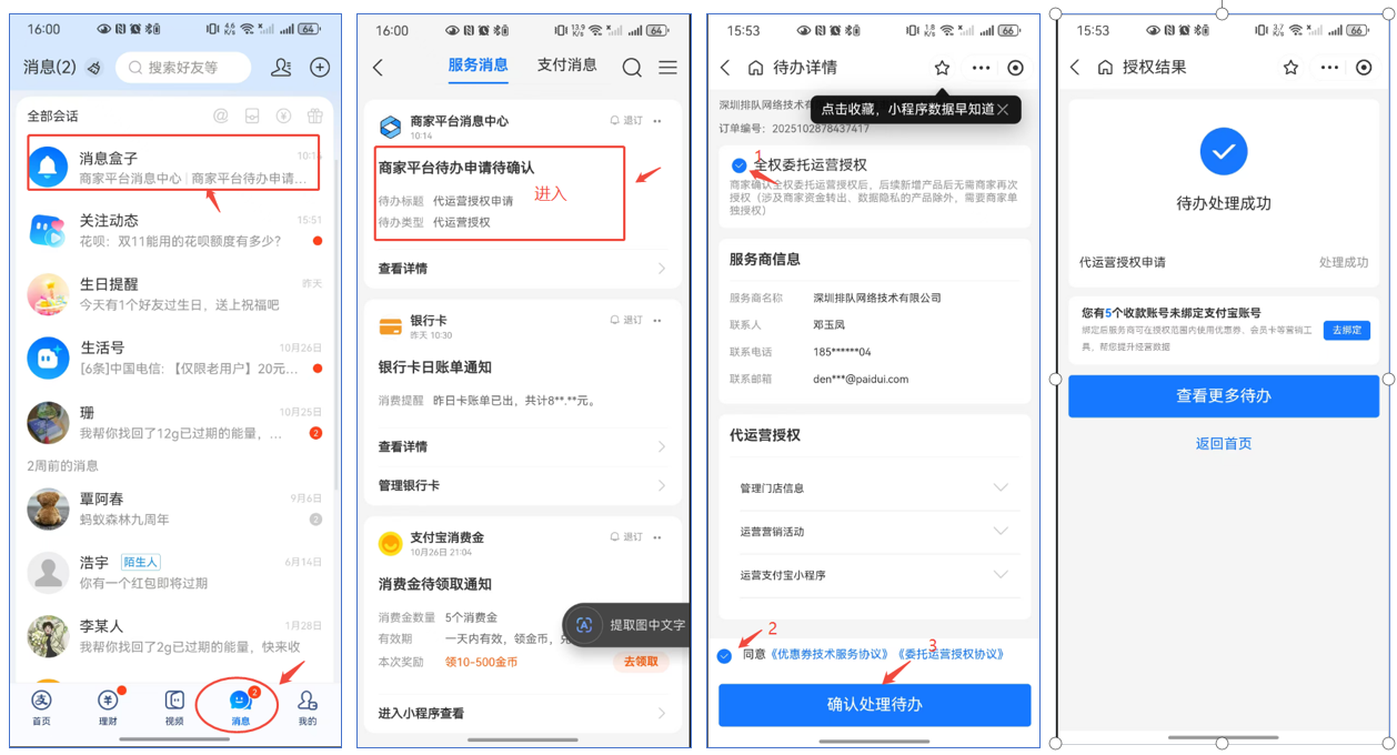 商户登录个人支付宝app,在消息盒子里可以看到【商家平台待办申请确认】,进去点确认授权成功后,支付宝授权流程申请完成,聚好付申请审核状态会变更为授权成功