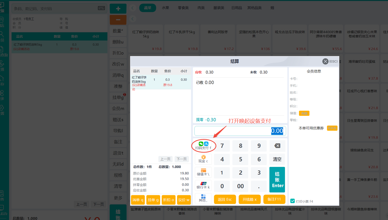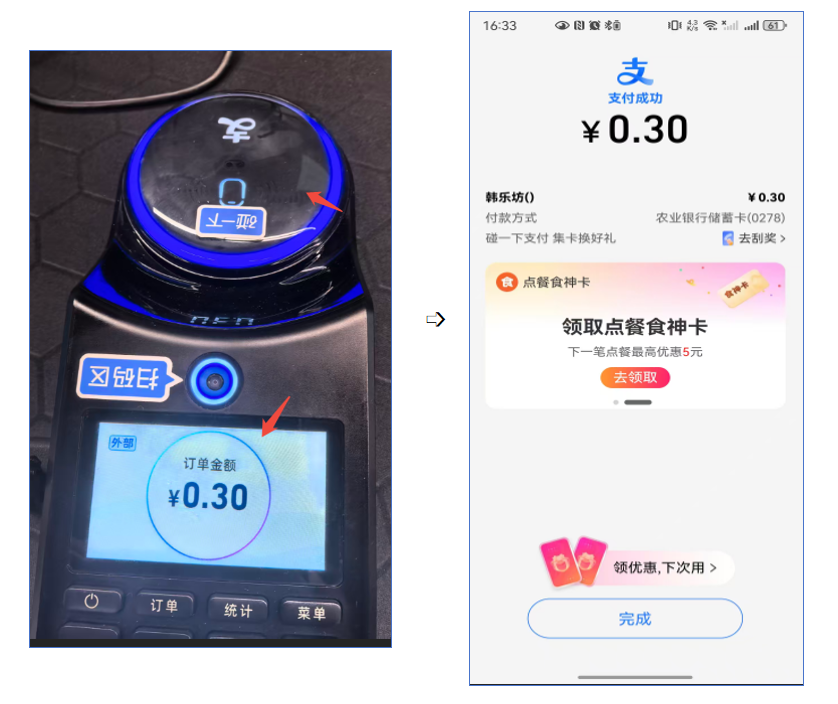 前台收银界面点单->结账->点击扫码支付会唤起N7HD支付设备收款->碰一碰支付或扫码支付即可。