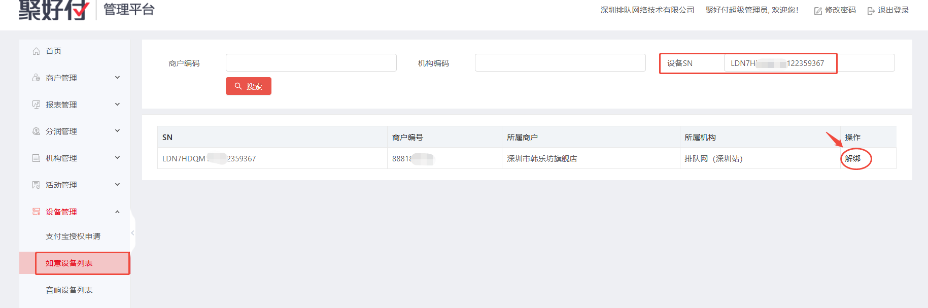 提供设备背面SN号,联系聚好付客服解绑即可。