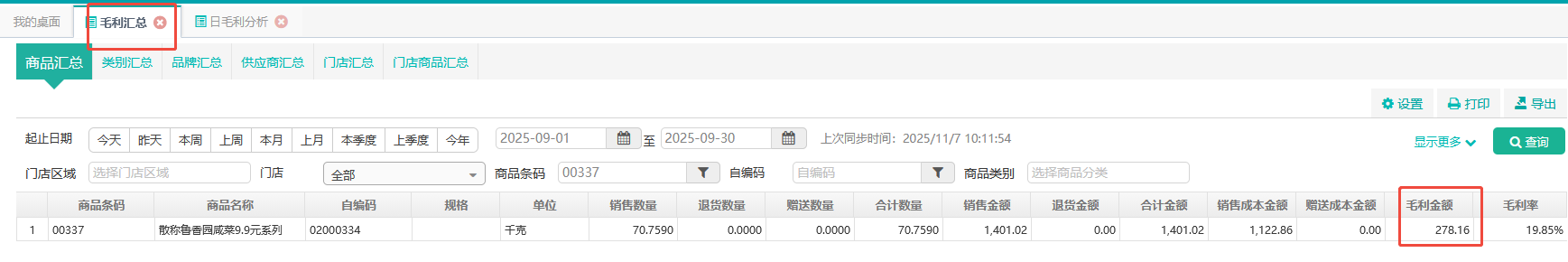 毛利汇总表:商品毛利金额是按日期先每一笔交易先四舍五入保留2位小数,在相加汇总得出的毛利总金额