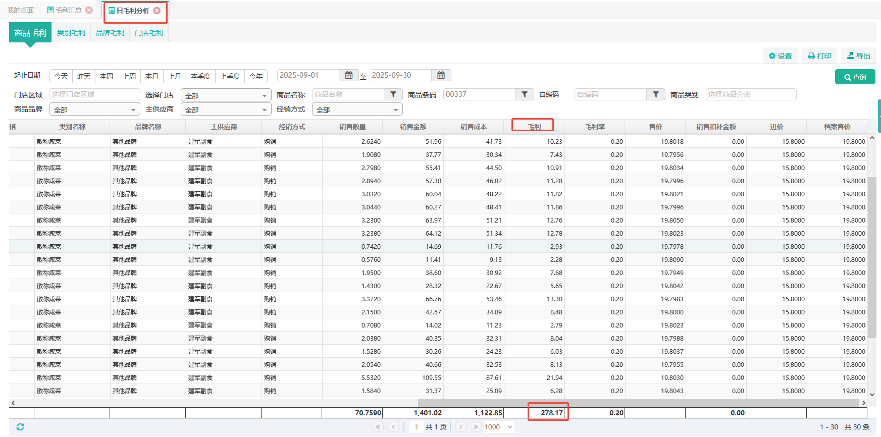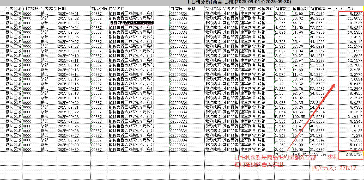 日毛利分析表:商品毛利金额是没有先四舍五入,而是每一比毛利金额全部相加得出毛利总金额,在四舍五入保留两位小数得出的毛利总金额