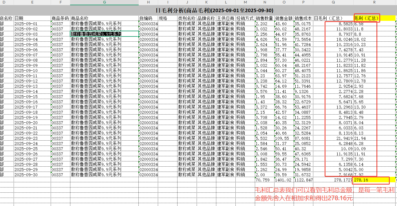 日毛利分析表毛利金额:由每一笔交易商品毛利先相加求和在四舍五入得出278.17元(图3)