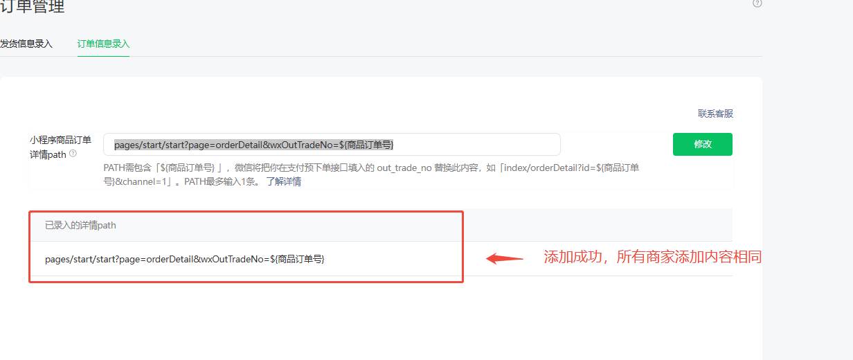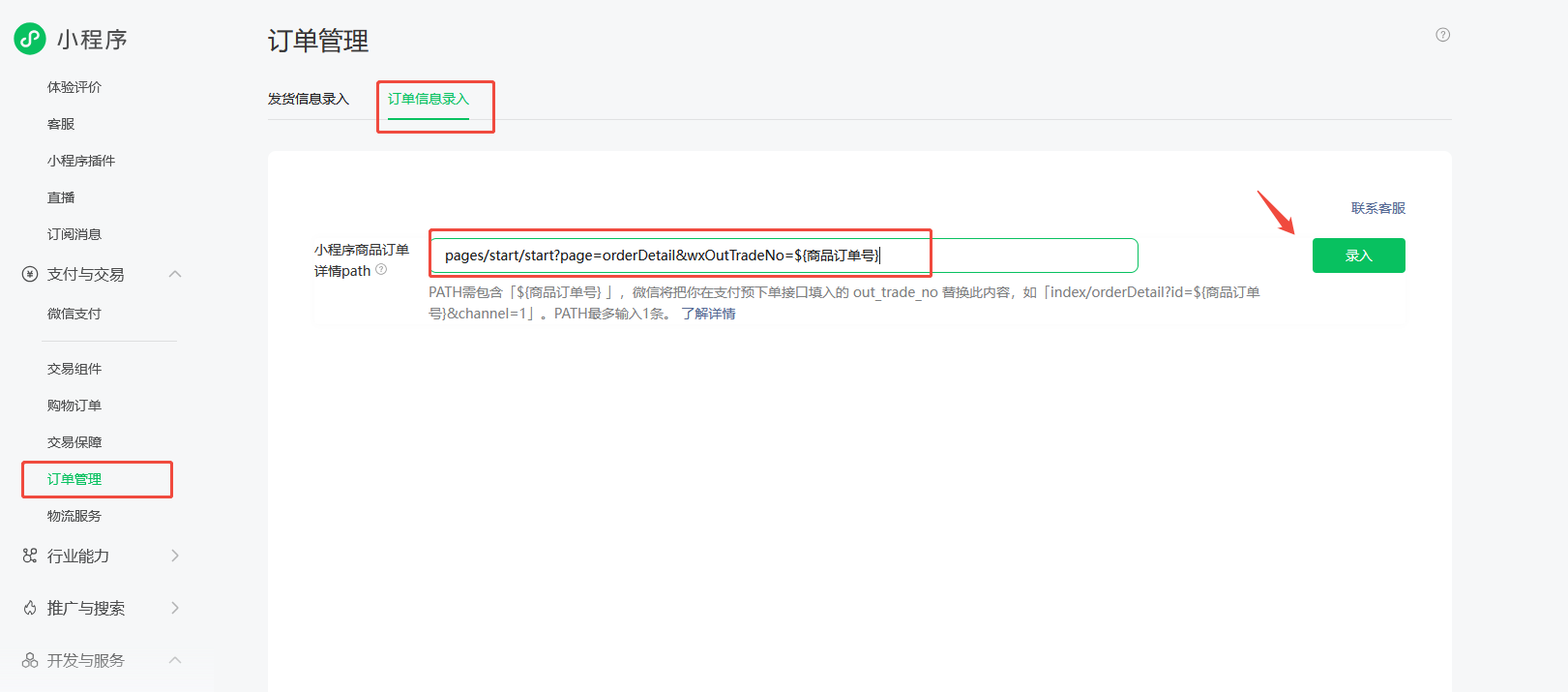 ->录入小程序商品订单详情path填入:pages/start/start?page=orderDetail&wxOutTradeNo=${商品订单号}
