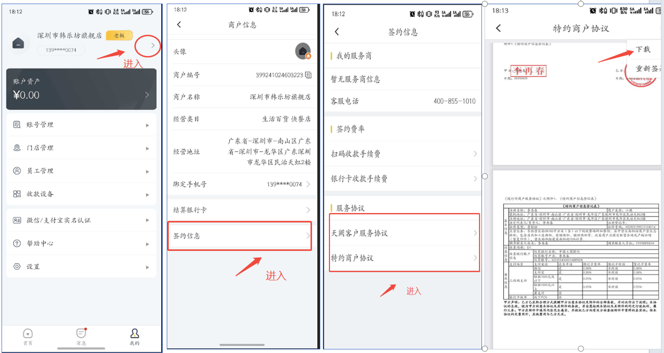 (2)登录商家管理员账号在聚好付客服群提供聚好付商编,开通管理员登录账号,密码会通过短信方式发送至联系人手机上,登录APP按下图路径进入下载电子协议。